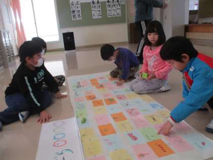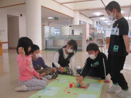 1・2年生は図画工作科の時間につくった「おはなしすごろく」を使用して、みんなで遊びました。なかなかゴールにたどり着けないようでした。
