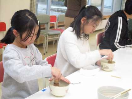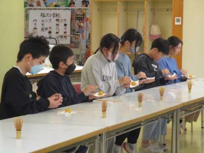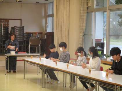茶菓子の取り方やお茶の点て方等、真剣に説明を聞きながら取り組みました。