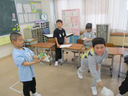 昔の遊びの学習で、ゴム跳びと紙てっぽうをしました。