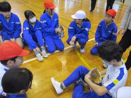 体育館に全員集まり、グローブと一緒に入っていたお手紙を校長先生に読んでもらいました。その後グローブを触ったり、手にはめたりして感触を楽しみました。