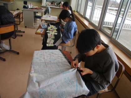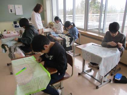 しつけ糸でしつけをしています。次は、いよいよミシンで縫います。 どの子供もエプロンの完成を楽しみにしています。