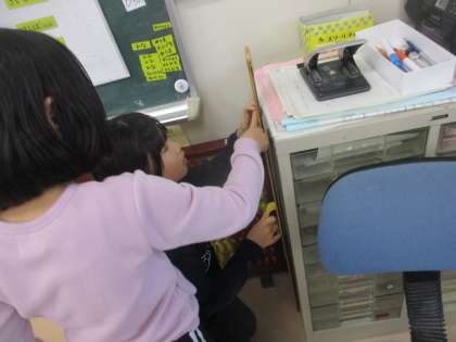 2年生 算数科 長い長さをはかろう 公開日 2024/02/05 更新日 2024/02/05 学校 2年生は1mという単位を学習し、1mものさしで教室にあるものを測ったり、自分たちで長いものさしをつくったりしました。学校にあるもの全部測ろうと、張り切っている2年生です。