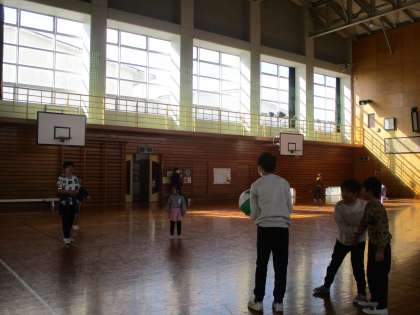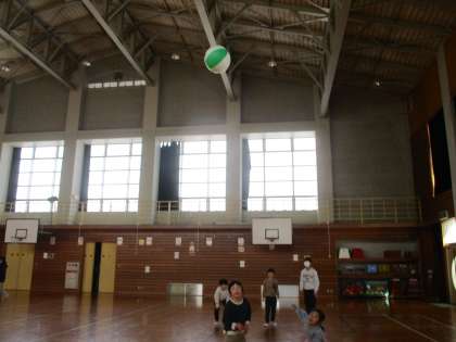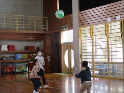 1年生から6年生までが混ざってビーチボールを楽しんでいます。