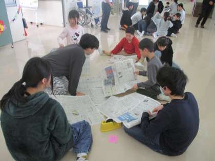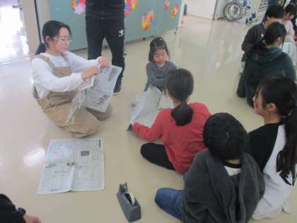 今月の誕生会のゲームは、新聞タワーゲームでした。どの班が一番高いタワーを新聞でつくることができるか競いました。
