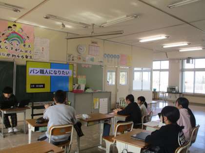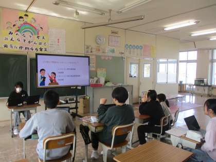 5年生は、総合的な学習の時間の学びをまとめたスライドを、4年生に見てもらいました。5年生のスライドのまとめ方や発表の仕方を見て、4年生は驚いていました。学習したことを伝えることができ、5年生は嬉しそうでした。