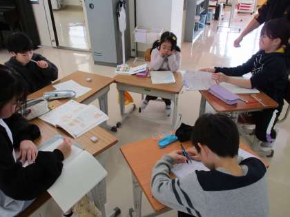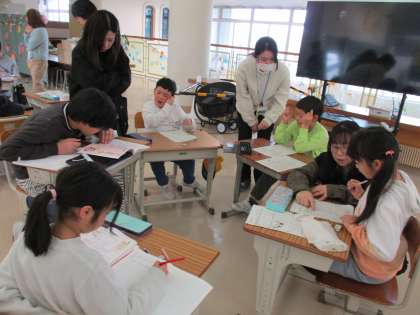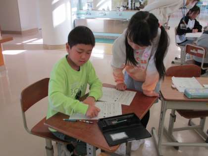 合同学習では、教え合ったり、質問したり、上学年に丸付けをしてもらったりと、みんなで学習を楽しみました。