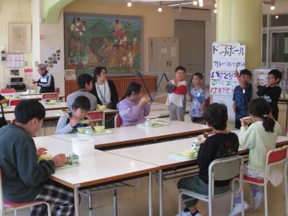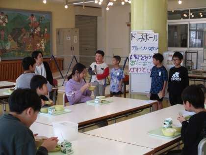 どんな風に伝えようかと2年生みんなで知恵を出し合い考えました。給食の時にランチルームで全校のみんなに伝えたらいいと考え、実際に伝えました。