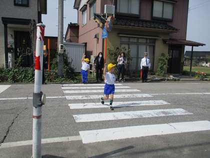 警察署の方から交通安全の基本ルールを学んだ後、実際に学校周辺を歩き、横断歩道の渡りか方等を確認しました。一人一人が安全を確認し、しっかりと手を挙げて渡ることができました。