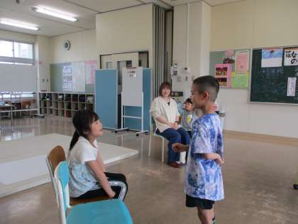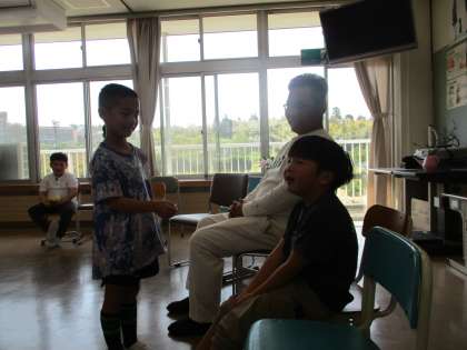 「緊張したけれど、しっかり発表できてうれしかった」、「○○さんと、○○さんの空手がかっこよかった」、「○○さんに、すもうで勝ててうれしかった」、「楽しくてハッピーマンになれた」、「スマイルにいっぱいなれた」などと、今日の振り返りの時間が素敵でした。