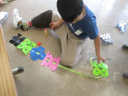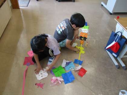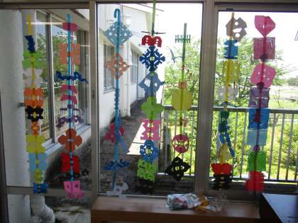 ちょきちょき切った折り紙をタフロンテープに貼っています。どれも素敵な飾りになりました。