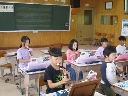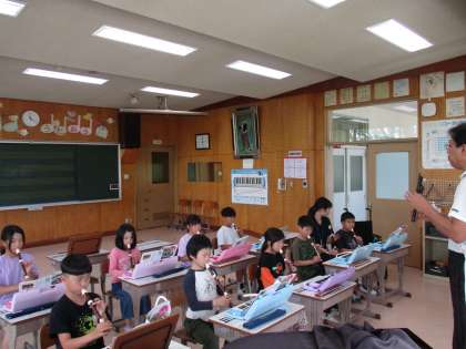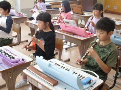 3・4年生の音楽では、リコーダーの練習をしました。「ドレミファソラシド」を吹けるように頑張ります。