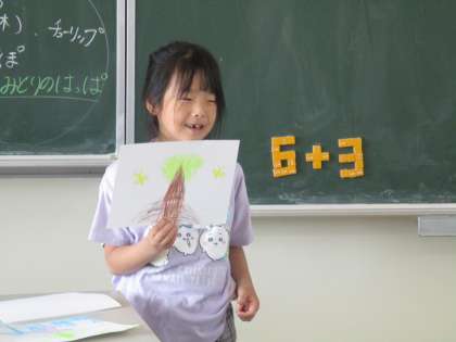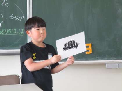 それぞれが描いたものを、次の時間に発表しました。上手に書けたところやその絵を描いた理由を発表したり、これはなんでしょうとクイズにして発表したりしました。