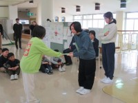 なかよし班で学校を掃除しています。少ない人数ですが、広い学校を一生懸命掃除しています。