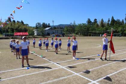 ゴーゴーゴーの歌を元気よく歌い、ラジオ体操を行いました。