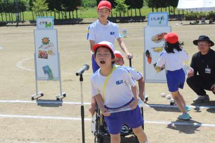 名産品を選び、児童のみんなで絵を描いたカバンにボールを入れてから、ゴールを目指します。