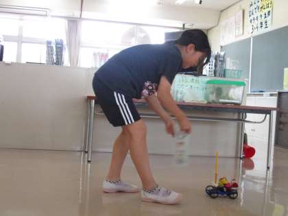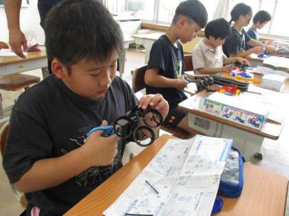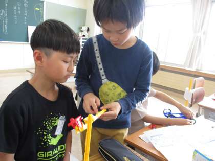 風邪とゴムのはたらきの学習で使用する実験教材の車を組み立てました。説明書を見ながら、自分たちで組み立てました。分からないところは、教え合いながら組み立てました。