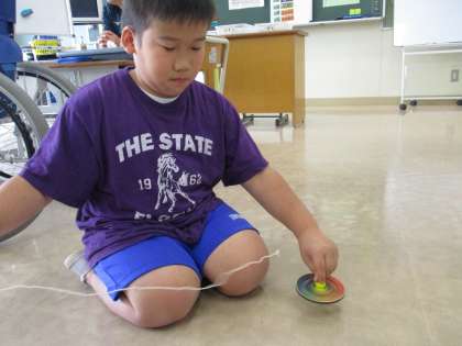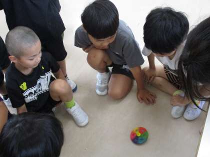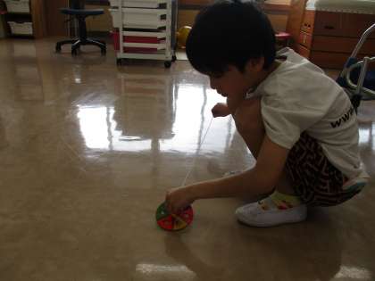 「こまを楽しむ」の授業で、色かわりごまをつくりました。こまに自分の好きな色を塗り、回したときの色を楽しみました。