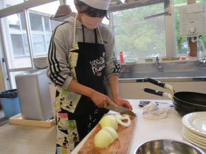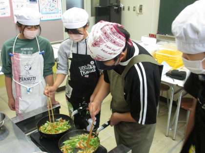 今日の調理実習では、にんじん、たまねぎ、ピーマン、魚肉ソーセージを使って、野菜炒めをつくりました。火の強さや味付けに気を付けながら協力して調理しました。
