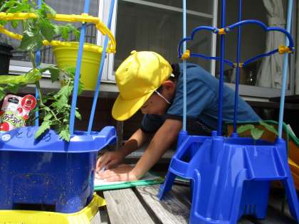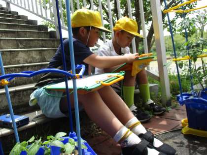前回の観察時よりも生長が見られました。2年生はミニトマトの実がなっていたり、1年生は、葉っぱが増えていたりと、喜ぶ様子が見られました。