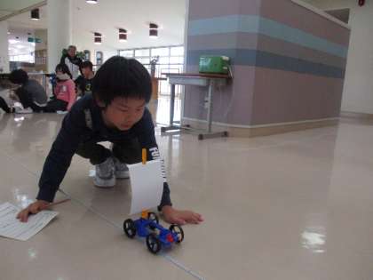 風受けの大きさによって、車の進む距離が違うのかを実験しました。
