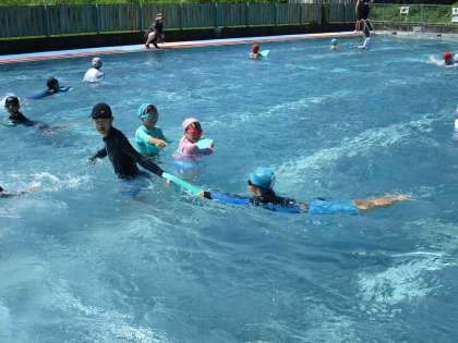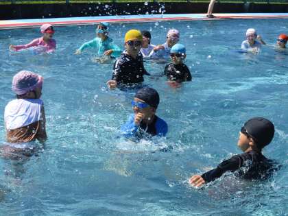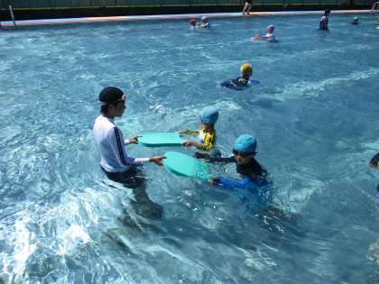 大プールに挑戦した下学年児童を上学年児童が補助して、水遊びを楽しみました。