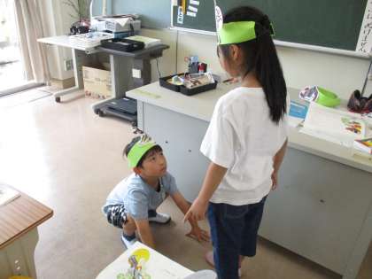 1年生(国語) 公開日 2024/06/24 更新日 2024/06/24 学校 『「おおきなかぶ」を発表しよう!』をめあてに、発表の練習をしました。 人数が少ないけれど、一人で二役三役しながら、台詞をよく覚え、かぶがなかなか抜けない演技も頑張りました。