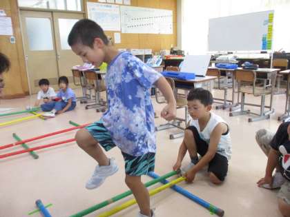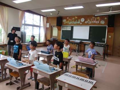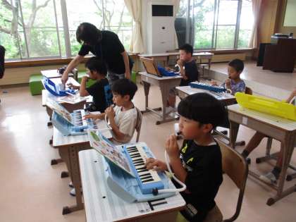 バンブーダンスでリズム遊びをしたり、鍵盤ハーモニカを弾いたり、音楽会に向けて歌の練習をしたりしました。子供たちは、汗だくになるくらい、元気に楽しく学習しました。