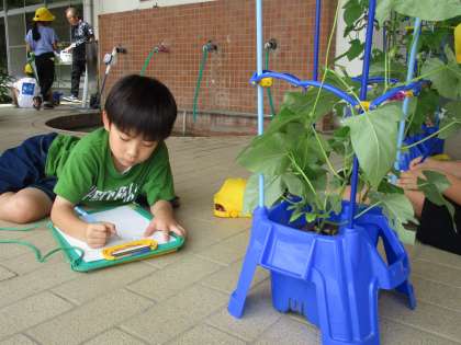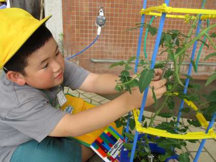 算数で物の長さを測る学習をしているため、「ミニトマトの実の大きさはどれくらいかな」と測っている児童もいました。