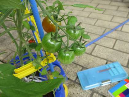 2年生のミニトマトには、たくさんの実がなっていました。もう赤くなり、食べれそうなミニトマトもありました。