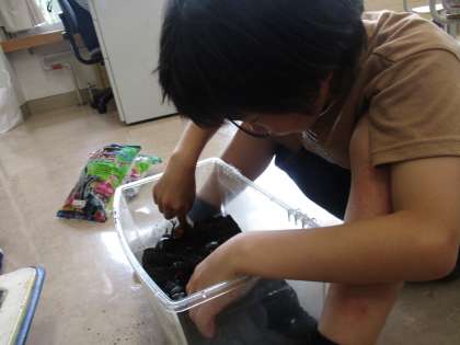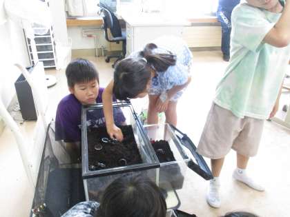 3・4年生教室では、カブトムシを育てています。エサをあげる当番表をつくったり、弱っているカブトムシがいないかなと確認したりして、毎日お世話を頑張っています。