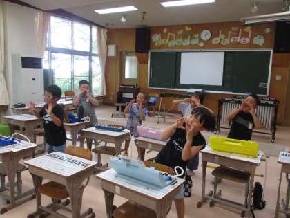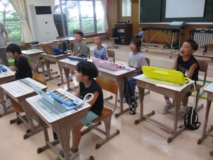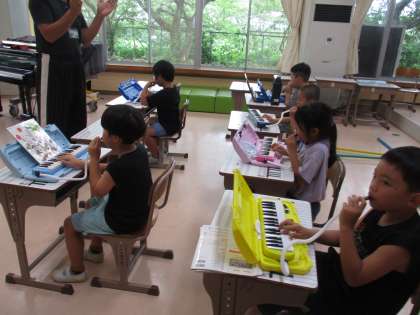 「かえるの合唱」を振り付けをしながら、楽しく踊って歌ったり、鍵盤ハーモニカを弾いたりしました。