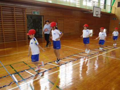 「チャレンジわざセブン」の種目に挑戦したり、ラダーを使った運動をしたりしました。