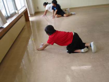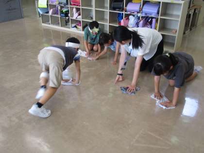 ワックスがけを行うために、子供たちは、教室の荷物を移動させたり、床を水拭きしたりして、ピカピカに掃除しました。
