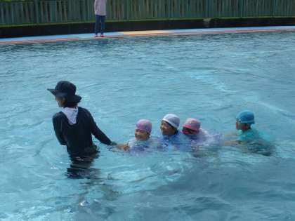 休憩時間には、プールサイドにいたカタツムリを観察する姿も見られました。