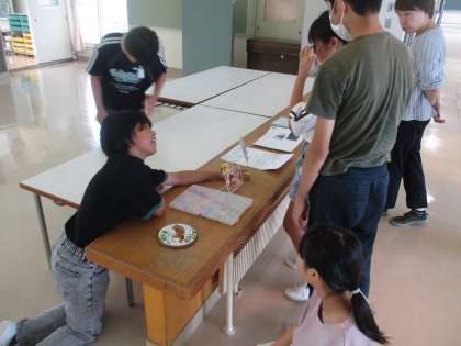 久しぶりに友達と会い、うれしそうな子供たち。「夏休みすごろく」で夏休みの思い出を話したり、夏休みにつくった作品を見合ったりして、みんなで楽しく過ごしました。