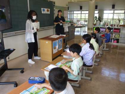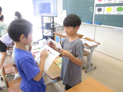 英語で友達の好きな色を質問したり、好きな色を答えたりしました。