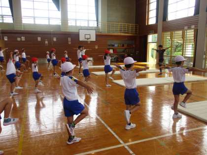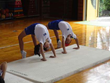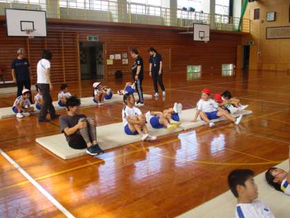 今日は、マット運動の基本の前転や後転、開脚前転、開脚後転、側転を教えていただきました。