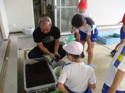 今年はカブトムシの幼虫がたくさん生まれました。たくさんの幼虫を育てるには、広い場所でたくさんのエサが必要だということが分かり、今日はみんなで協力して、幼虫を広い場所へ移しました。