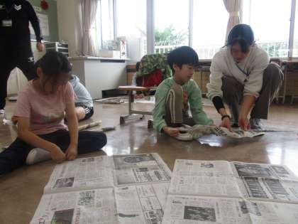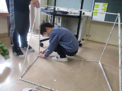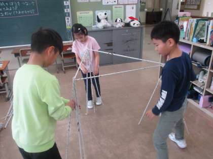 「新聞紙を使って棒をつくり、棒をつなげてたたせよう」という課題に取り組みました。棒をたたせるには、どうしたらよいのか、どのようにすると丈夫な棒になるのかを考えながら作成しました。