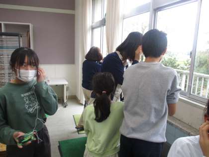 ラジオ完成後は、窓側に行って電波を探しながら、みんなでラジオを聞きました。