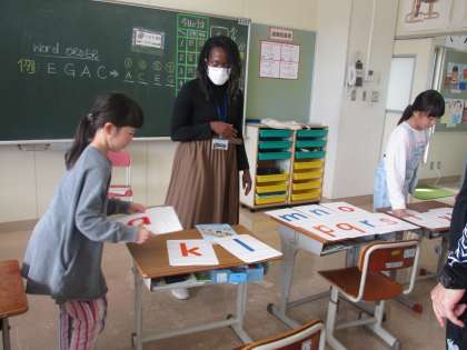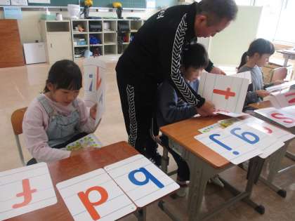 バラバラに配置されたアルファベットを協力してaからzの順番に並べ替えたり、アルファベットの歌を歌ったりしました。