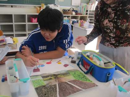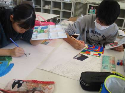 「まだ見ぬ世界」をテーマに、それぞれが選んだ写真を使って、想像の世界を描いています。どんな世界になるのか、完成がとても楽しみです。
