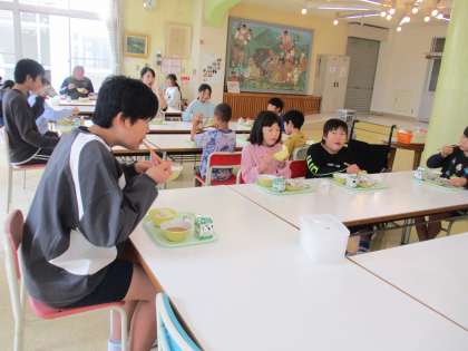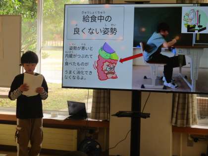 今日の給食の時間に、元気いっぱい健康委員会の児童から、給食中の姿勢について発表しました。