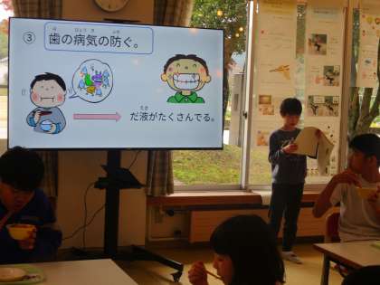 11月19日の給食の時間に、元気いっぱい健康委員会の児童が、1学期に学習したよくかんで食べると体によい8つのことの合言葉「ひみこのはがいーぜ」を振り返ろうというテーマで、クイズ形式にして発表しました。福沢っ子は、「ひみこのはがいーぜ」を思い出し、よく噛むことを意識して給食を食べました。