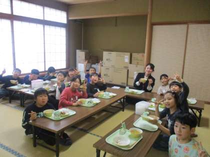 今日は、本校で研修会があるため、家庭科室と礼法室で給食を食べました。