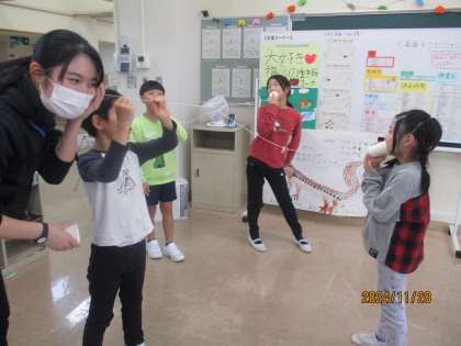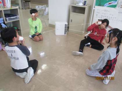 糸電話で話したときに、糸がどうなっているかを観察し、音を伝える物は震えるということが分かりました。