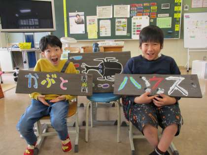 2人で協力して作成した「カブトハウス」の看板が完成しました。