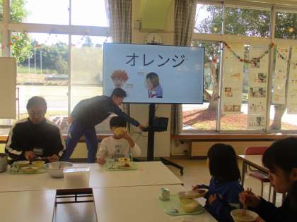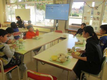 くじ引きで引いた席に座り、いつもとは違うメンバーと楽しく給食を食べています。また、事前アンケートで福沢小音楽ランキングを決め、ベスト5を1日1曲ずつ流しています。2日目の今日は、第4位の「オレンジ」という曲でした。