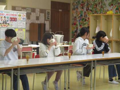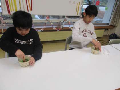 茶道教室は毎年行っているため、5、6年生はお茶の点て方を覚えており、慣れた様子でスムーズにお茶を点てていました。4年生は、初めてのお茶点てに戸惑いながらも、一生懸命取り組んでいました。