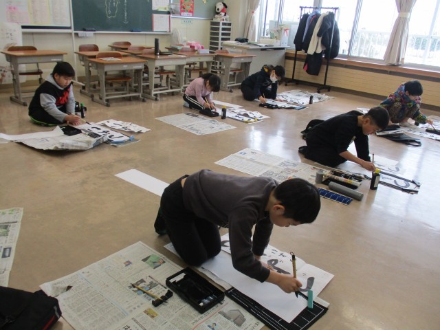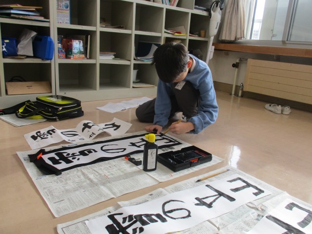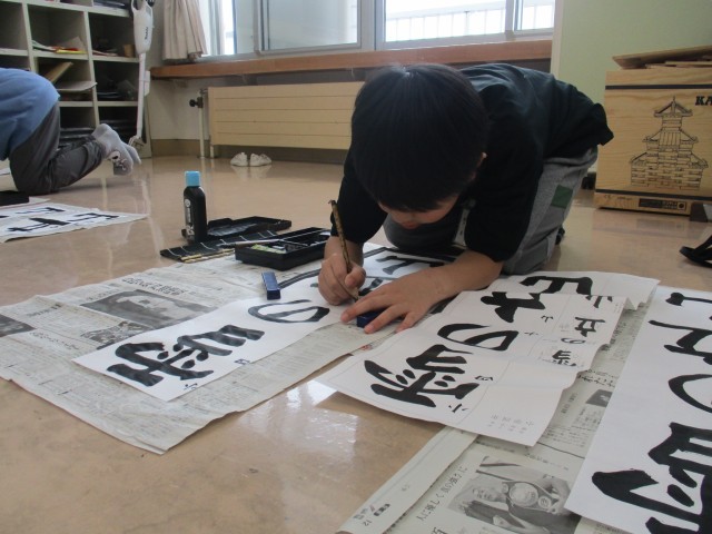 3年生は、毛筆での初めての書初大会に、緊張しながらも真剣に書きました。